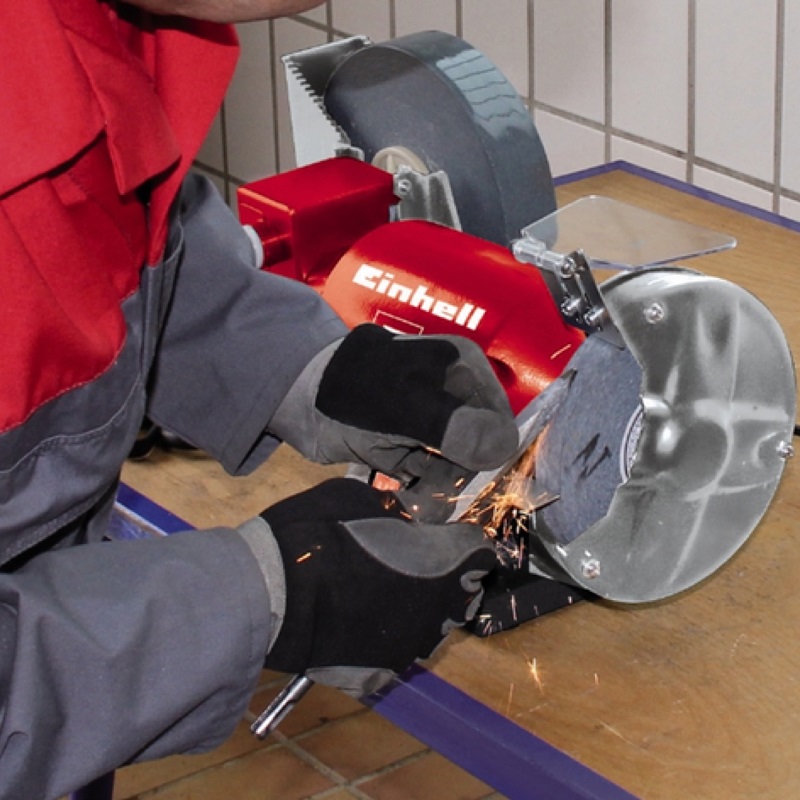 Jest niezbędnym pomocnikiem we wszystkich pracach szlifowania na mokro i na sucho, np. ostrzenie noży i ostrzy. Ta szlifierka jest wyposażona w jedną gruboziarnistą ściernicę i jedną wolnoobrotową, drobnoziarnistą ściernicę. Cztery gumowe nóżki minimalizują wibracje. Wyposażona jest w boczne osłony tarczy i przezroczyste osłony przed iskrami. Dzięki regulowanym podporom bocznym łatwiej jest obrabiać szlifowany przedmiot.