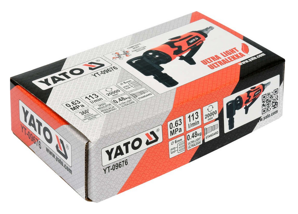 Szlifierka pneumatyczna trzpieniowa Yato YT-09676 jest narzędziem zasilanym strumieniem sprężonego powietrza przeznaczonym do szlifowania i cięcia, wiercenia metalu, drewna lub tworzyw sztucznych. Szlifierka kątowa trzpieniowa Yato YT-09676 wykorzystuje narzędzia trzpieniowe tnące i szlifujące o średnicy trzpienia 6 mm. Szlifierka Yato YT-09676 posiada kompozytową obudowę i posiada szybkozłącze 1/4" do zasilania sprężonym powietrzem. Stosowana w warsztatach motoryzacyjnych i w przemyśle.