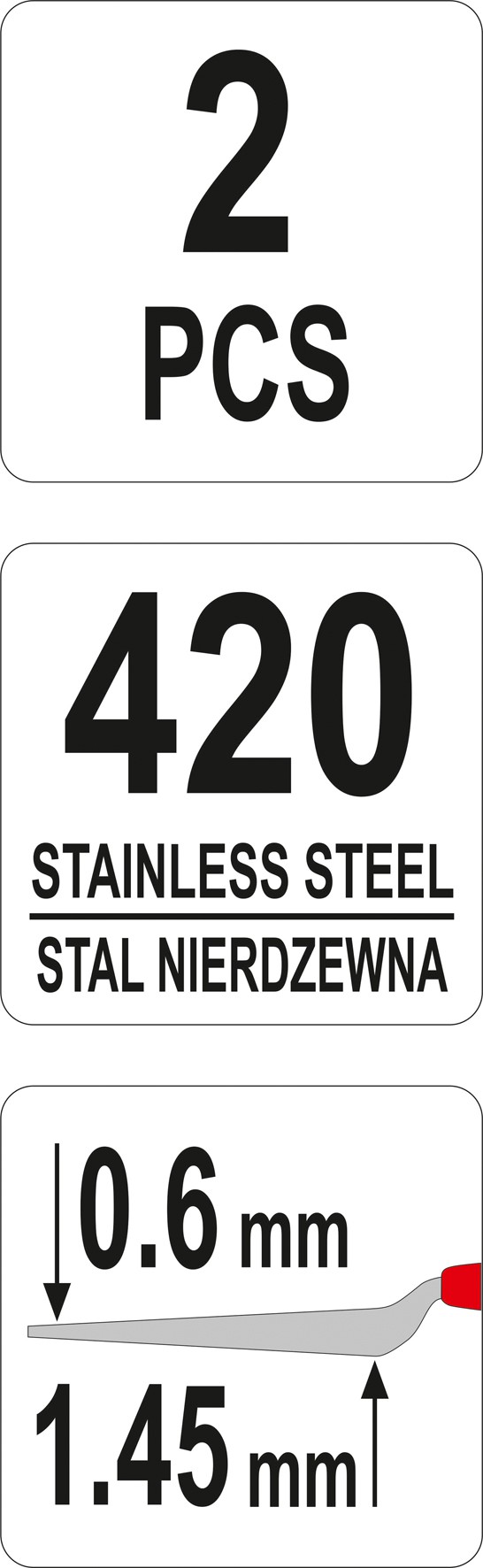 Szpachelki sztukatorskie dwustronne odgięte, wymiary- 8 x 192 mm i 26 x 254 mm , kształt łopatki liść i prostokąt, materiał sprężysta stal nierdzewna o symbolu 420s/s , część robocza szlifowana 1,45-0,6 mm, uchwyt na środku z tworzywa.