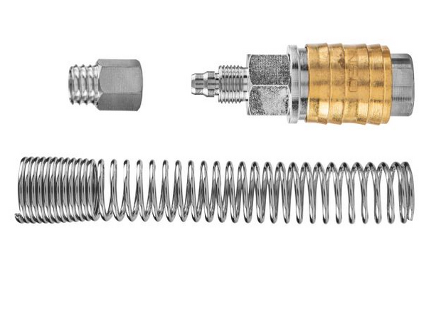 Szybkozłączka do sprężonego powietrza na wąż Neo 12-602 to osprzęt do uzbrajania węża sprężonego powietrza. Szybkozłączka na wąż Neo 12-602 wykonana z wysokiej jakości stali nierdzewnej i mosiądzu, gwarantując szybką obsługę, szczelność i niezawodność. Dzięki sprężynie przewód ciśnieniowy odchyla się łagodnie nie załamując się za złączką. Maksymalne ciśnienie robocze szybkozłącza to 16 bar.