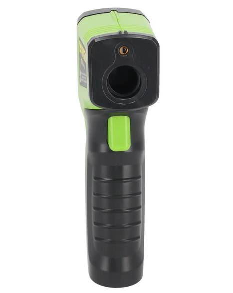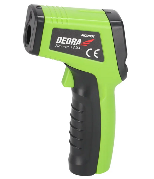 Bezdotykowy termometr laserowy Dedra MC0951 do mierzenia temperatury różnych powierzchni. Pirometr MC0951 umożliwia szybki i dokładny pomiar (czas odpowiedzi to 0,5 sekundy), i odczyt na czytelnym wyświetlaczu LCD. Termometr laserowy Dedra MC0951 umożliwia wybór między dwoma skalami pomiaru: stopnie Celsjusza lub Fahrenheita. Zakres pomiaru wynosi od -50 do 600° Celsjusza lub od -58 do 1112° Fahrenheita. Pirometr Dedra MC0951 generuje wiązkę lasera II klasy. Wrażliwość widmowa w zakresie 8-14um. Urządzenie może pracować przy wilgotności względnej od 10 do 40% RH. Zasilanie popularnymi bateriami AAA (2szt.).
