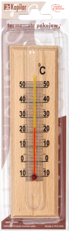 Termometr pokojowy służy do pomiaru temperatury panującej w pomieszczeniach zamkniętych. Pomiar dokonywany jest w przedziałach - 15°C do +50°C z dokładnością +/-1°C.
