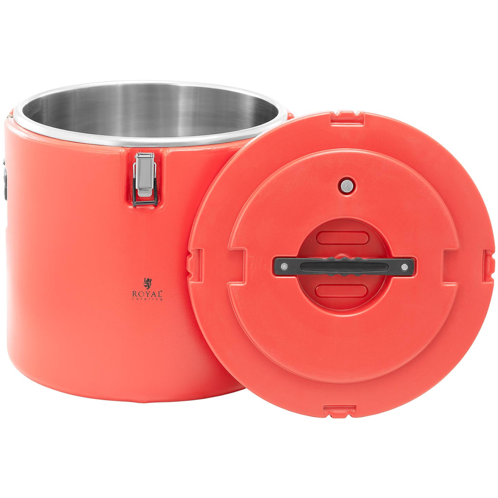 Termos gastronomiczny marki Royal Catering zaprojektowany został do wygodnego transportu ciepłych oraz zimnych dań i napojów. Idealnie sprawdzi się w restauracjach, hotelach, stołówkach oraz do cateringu. Termos ma pojemność 48 l i wymiary śr. 465 x 445 mm. Wnętrze wykonane zostało z żaroodpornej i łatwej w czyszczeniu stali nierdzewnej, obudowa zaś z wytrzymałego tworzywa sztucznego. Dwuścienna izolacja pozwala utrzymać temperaturę dań, która zmienia się o ok. 1-2C/h. Termos zamykany jest na zatrzaski oraz posiada odporny na wstrząsy spód. Uchwyty ułatwiają przenoszenie. Termos jest bardzo higieniczny, odporny na zabrudzenia oraz neutralny w kontakcie z żywnością.