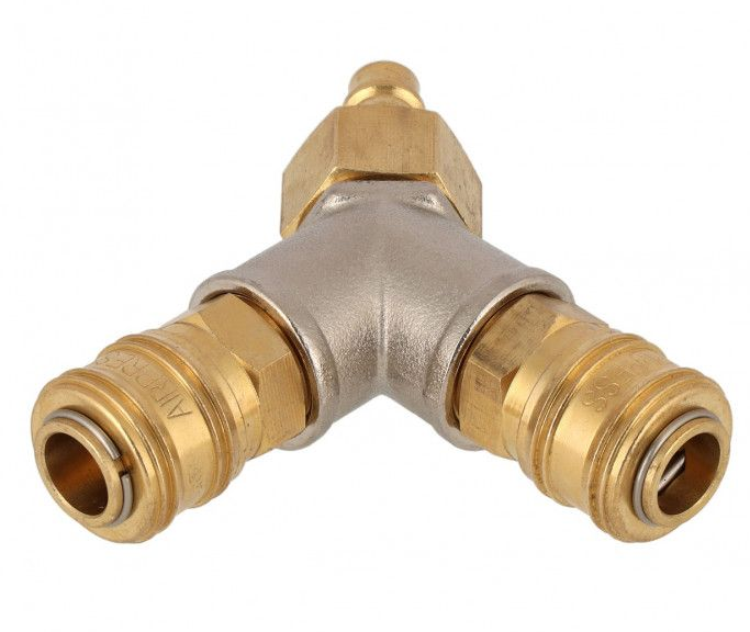 Trójnik do sprężonego powietrza z szybkozłaczami 1/2" Airpress 4303047 to osprzęt do układów sprężonego powietrza pozwalający na rozgałęzienie jego przyłączy. Trójnik z szybkozłaczami 1/2" Airpress 4303047 wykonany jest  z wysokiej jakości stali nierdzewnej i mosiądzu, gwarantując szybką obsługę, szczelność i niezawodność. Maksymalne ciśnienie robocze szybkozłączy to 15 bar.