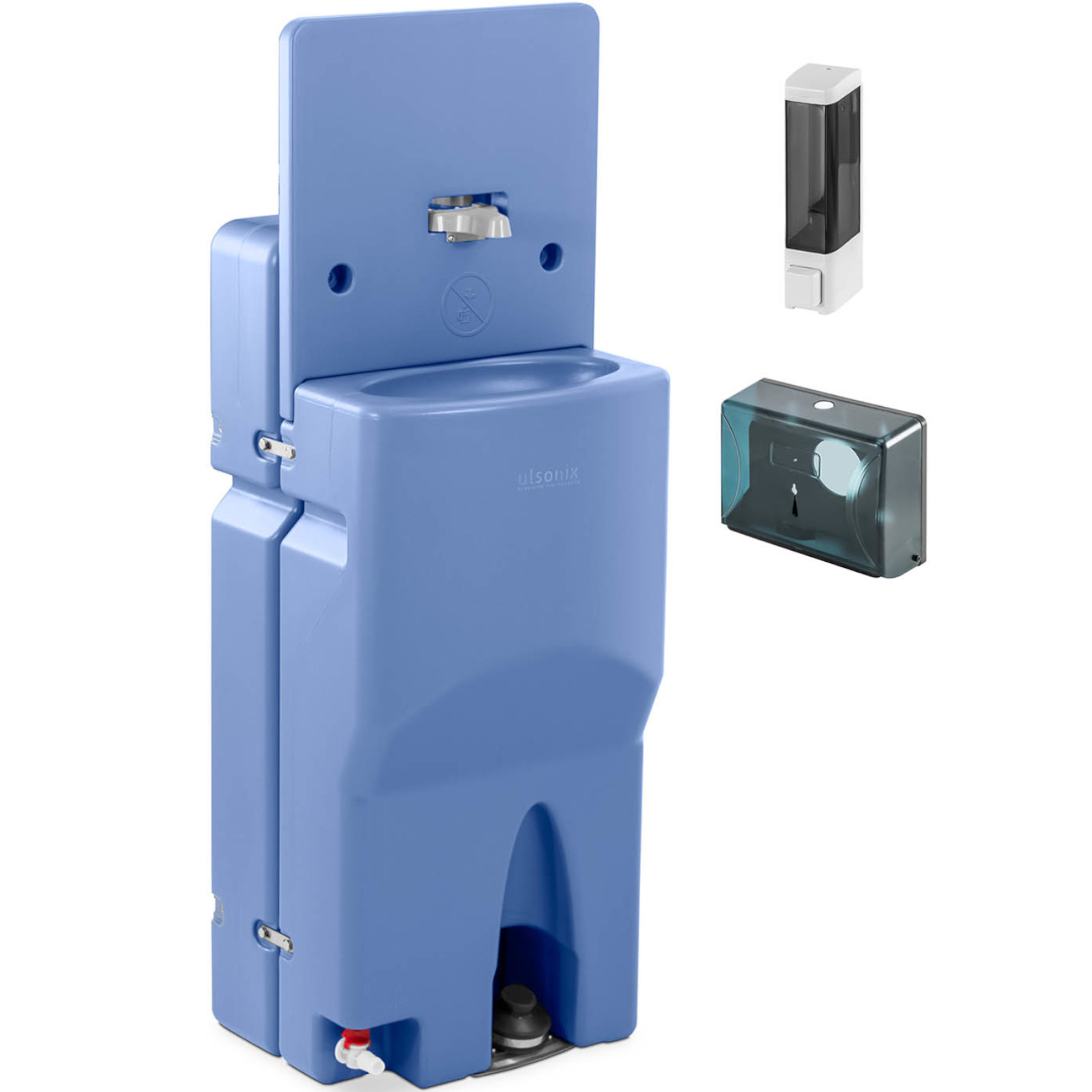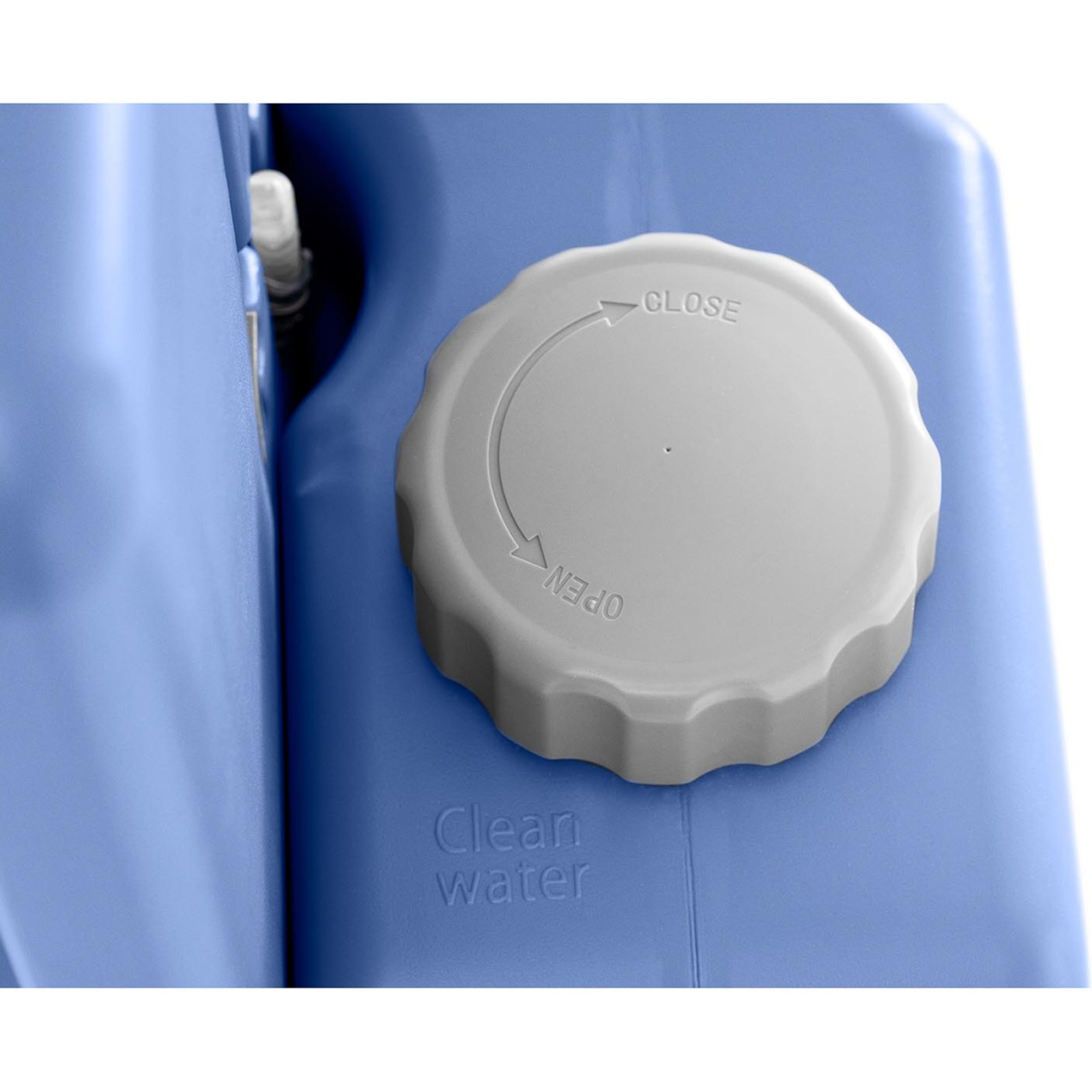 Podwójna umywalka posiada zbiornik na czystą wodę o pojemności 65 l oraz zbiornik na ścieki o pojemności 65 l. Umożliwia to korzystanie z urządzenia bez stałego dostępu do połączenia dopływów i odpływów. Jednocześnie odpowiednie przyłącza do zbiorników wody są dołączone do zakresu dostawy i sprawdzają się w razie potrzeby uzupełnienia wody lub spuszczenia ścieków. Bateria obsługiwana jest za pomocą pedału nożnego, co jest bardzo wygodne i wyjątkowo higieniczne. Zintegrowany dozownik mydła o pojemności 200 ml oraz uchwyt na papier zapewniają wysoki standard higieny. Korek do odpływu zabezpieczany został stalowym łańcuchem, dzięki czemu nie zgubi się. Umywalka wykonana została z wytrzymałego tworzywa sztucznego.