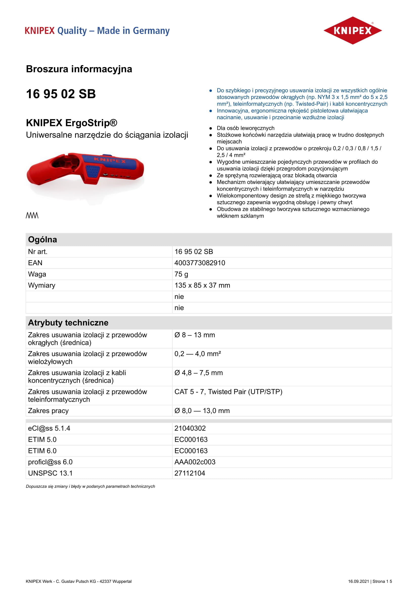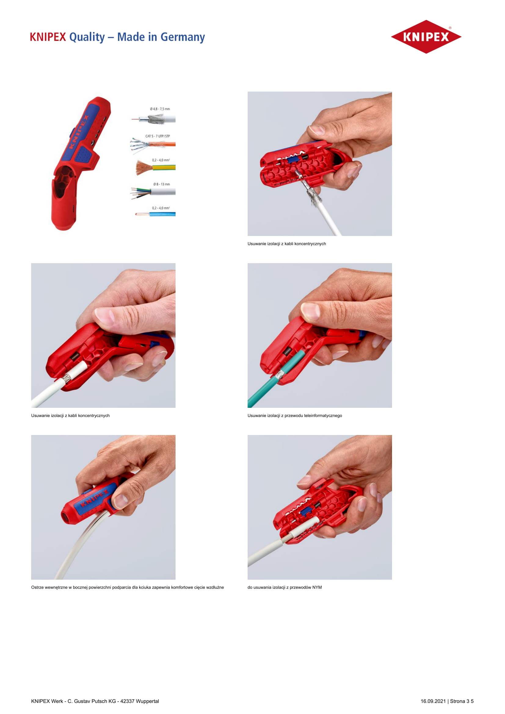 Do szybkiego i precyzyjnego usuwania izolacji ze wszystkich ogólnie stosowanych przewodów okrągłych (np. NYM 3 x 1,5 mm2 do 5 x 2,5 mm2), teleinformatycznych (np. Twisted-Pair) i kabli koncentrycznych