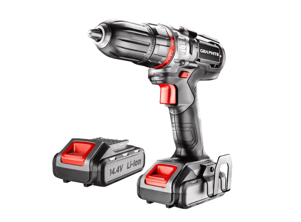 Wysokiej klasy dwubiegowa wiertarko-wkrętarka GRAPHITE, zasilana wydajnym akumulatorem Li-Ion 14.4 V o pojemności 2.0Ah.