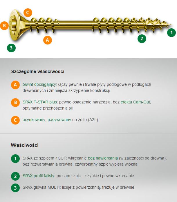 z żeberkami frezującymi , szpicem SPAX 4CUT i gwintem dociągającym , hartowany , pokryty powłoką zmniejszającą tarcie ,