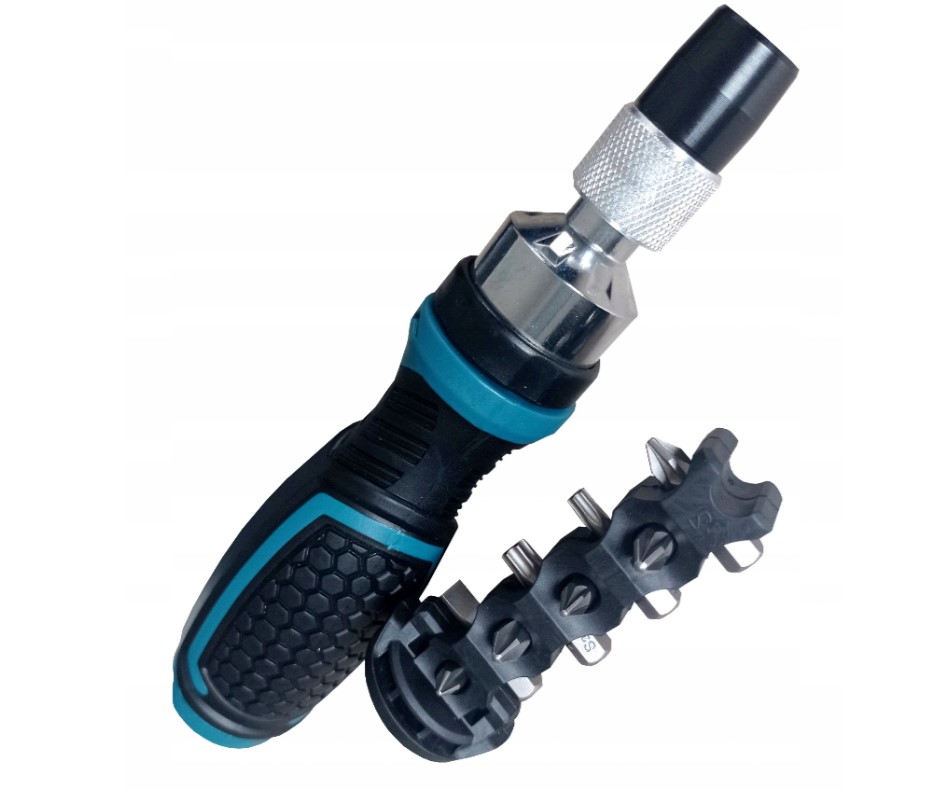 Wkrętak funkcyjny z uchwytem magnetycznym P-90071 Makita to urządzenie wyposażone w grzechotkę, która umożliwia przełączanie obrotów prawo-lewo. Rączka została oprawiona gumą antypoślizgową, co w połączeniu z jej ergonomicznym kształtem sprawia, że dobrze leży w dłoni i nie powoduje jej zmęczenia nawet podczas dłuższych prac. Ponadto w rączce znajduje się schowek, dzięki któremu bity zawsze będą pod ręką - dzięki gwintowanemu wieczku z tworzywa operator ma pewność, że elementy się nie zgubią.