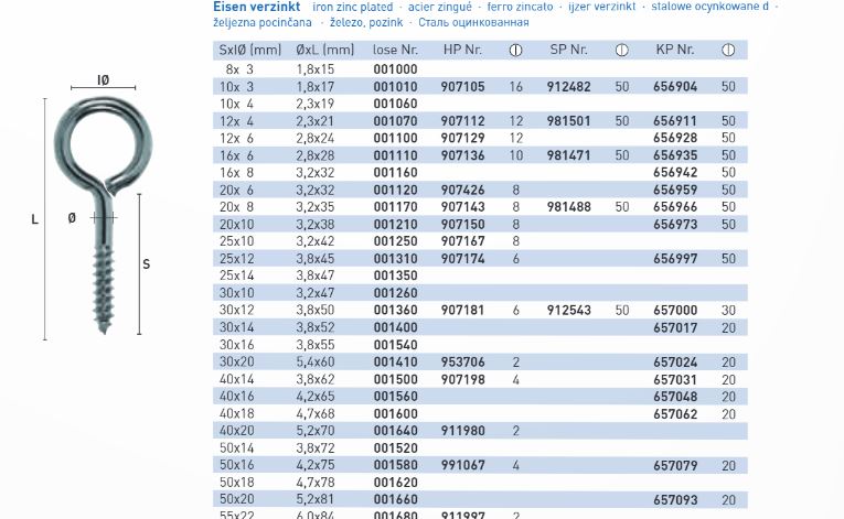 WKRĘTY OCZKOWE OCYNKOWANE 3.8*50*14MM