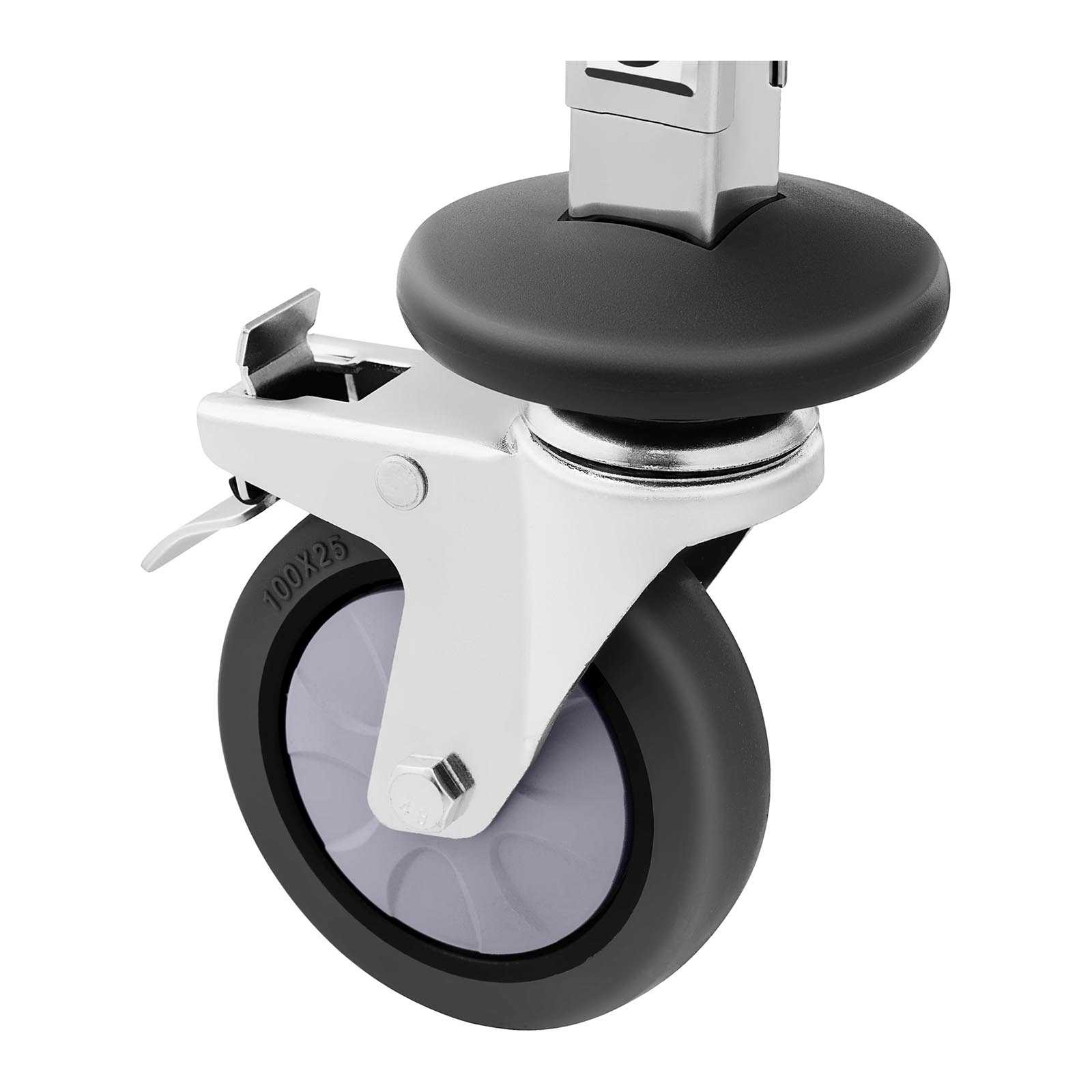 Wózek wyposażono w cztery skrętne kółka (oś skrętu 360) z czego dwa posiadają zamontowane hamulce. Pozwoli to na sprawne manewrowanie oraz zachowanie stabilności przy rozładunku. Kółka wykonano z termoplastycznej gumy, które są ciche, absorbują wstrząsy oraz nie pozostawiają śladów na podłodze. Charakteryzują się również dużą odpornością na zmiany temperatur. Specjalne odbojniki chronią wózek przed otarciami o ścianę i meble.