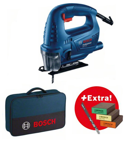 Profesjonalna wyrzynarka Bosch GST 700 06012A7021 wyposażona w 5-częściowy zestaw brzeszczotów i 3-częściowy zestaw gąbek szlifierskich.