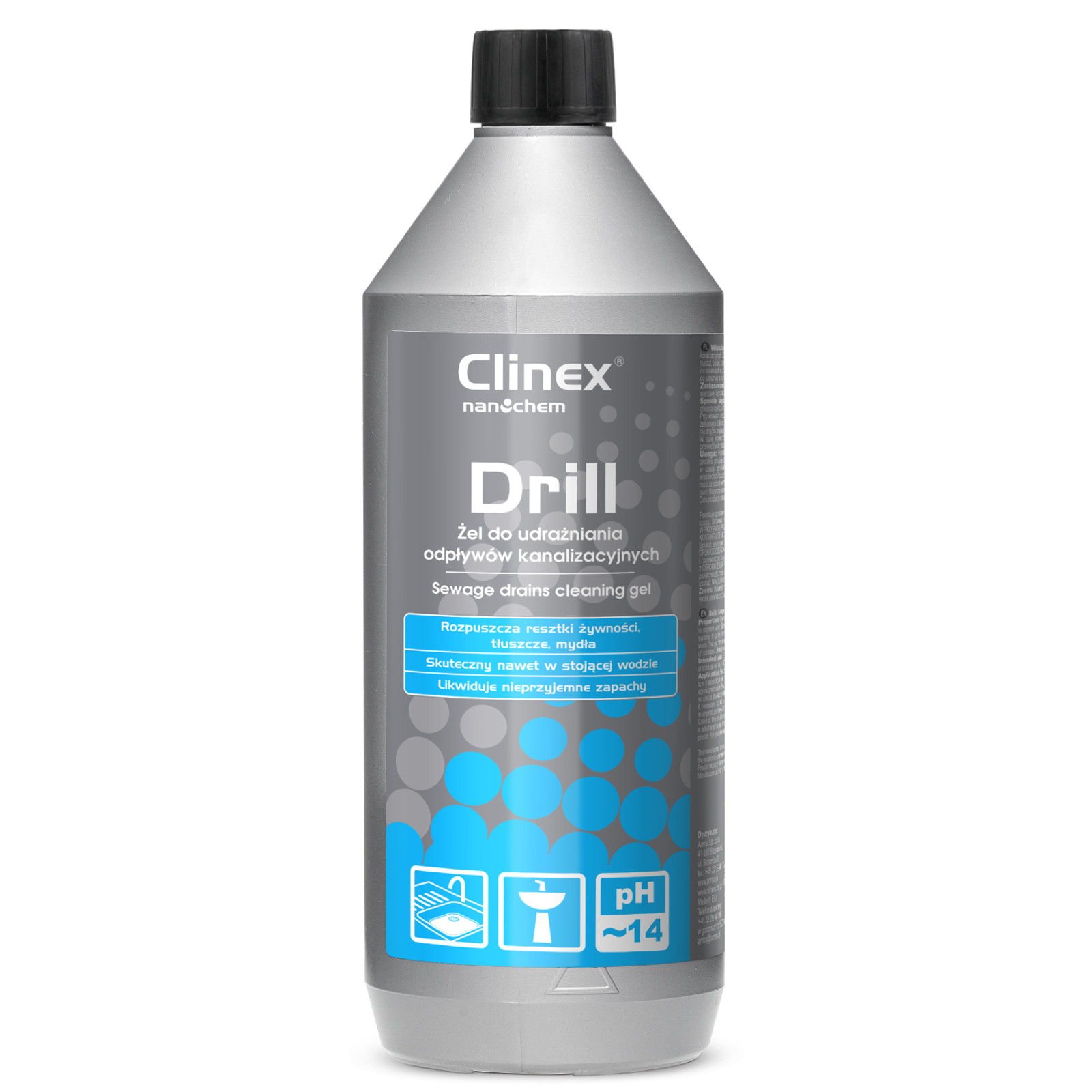 CLINEX Drill 1L:Gotowy do użycia żel do udrażniania rur i syfonów w instalacji kanalizacyjnej. Szybko rozpuszcza wszelkie stałe i organiczne zanieczyszczenia takie jak: tłuszcz, papier, watę, odpadki kuchenne, mydła, włosy. Forma żelowa pozwala na osadzanie się preparatu na ściankach rur przedłużając proces działania. Likwiduje nieprzyjemne zapachy.