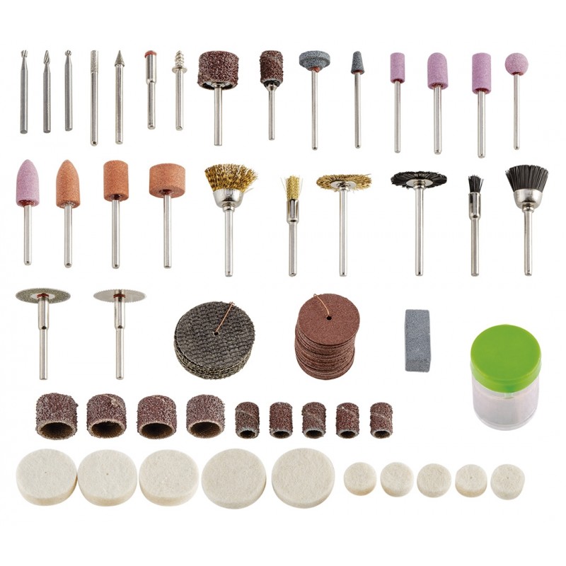 Akcesoria do miniwiertarki VERTO (nr ref. 50G029), zestaw 100 szt. zawiera komplet wierteł, tarcz tnących, ściernych,