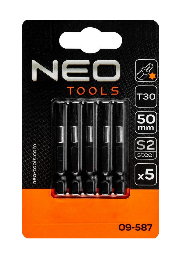 Bity udarowe NEO (nr ref. 09-587) to zestaw 5 profesjonalnych bitów udarowych typu T30 o długości 50 mm. Przeznaczone są do wkrętarek 1/4”. Posiadają system, który zabezpiecza je przed wyślizgnięciem się grota z wkręta. Bity wykonane zostały ze stali S2. Umożliwiają osiągnięcie wysokiego momentu dokręcania równego 21,8 Nm. System absorbcji momentu zabezpiecza końcówki przed szybkim zużywanie i znacznie przedłuża ich żywotność.