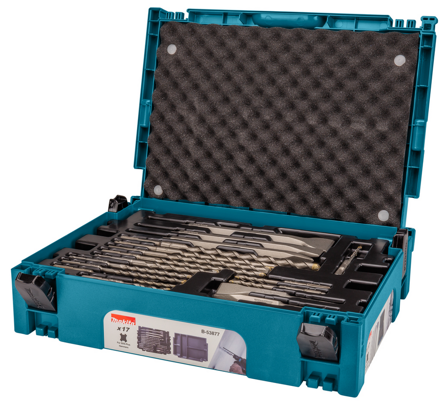 Zestaw dłut i wierteł SDS+ Makita B-53877  12 sztuk wierteł z ostrzem z węglika spiekanego (HM/CT), 3 szt. dłut oraz 2 szt. szpiców.