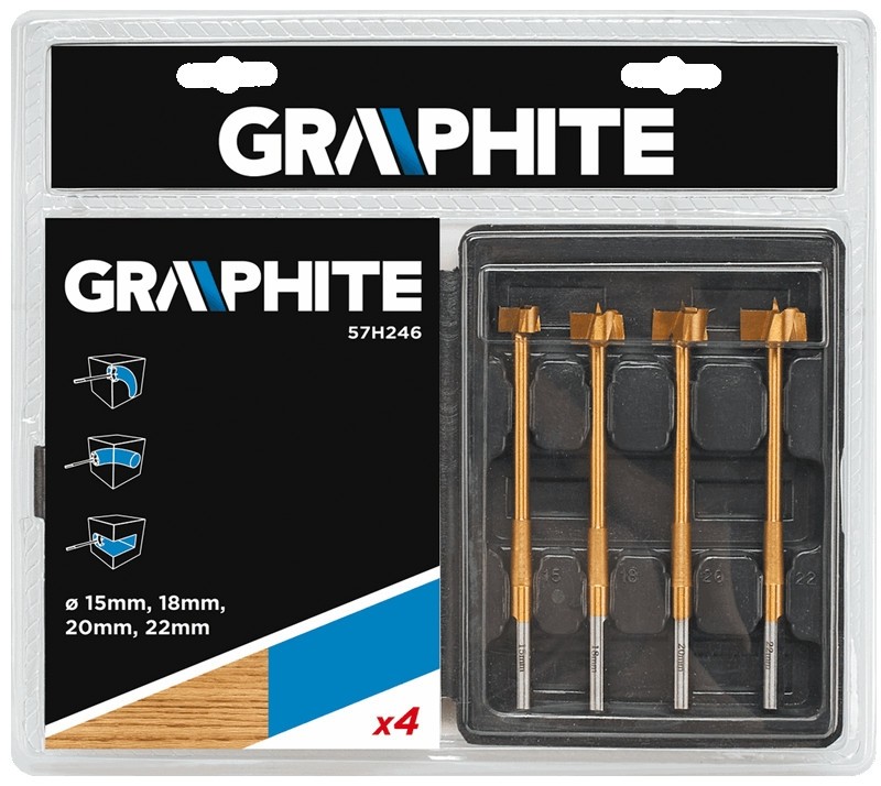 Zestaw frezów uniwersalnych GRAPHITE (nr ref. 57H246) pozwala na wiercenie i frezowanie skomplikowanych otworów w drewnie. Kształt ostrzy pozwala na wiercenie osiowych i nieosiowych otworów, frezowanie kieszeni i wpustów. Pokrycie ostrzy powłoką z azotku tytanu w znaczący sposób zwiększa żywotność ostrzy tnących. Trójstonnie fazowany uchwyt frezu pozwala na pewny montaż w uchwytach wiertarskich.