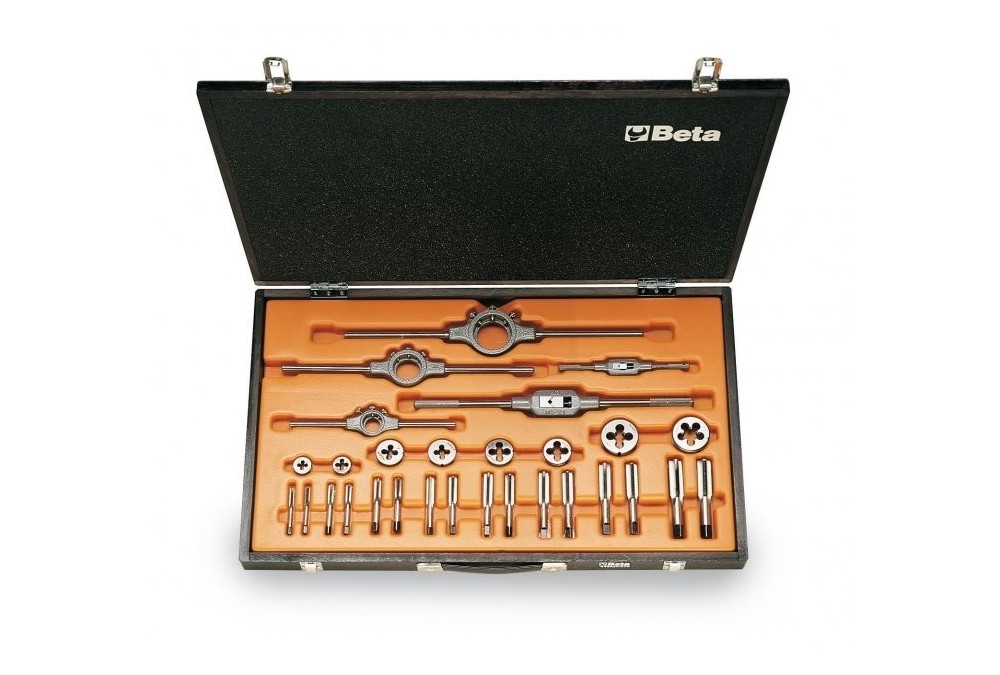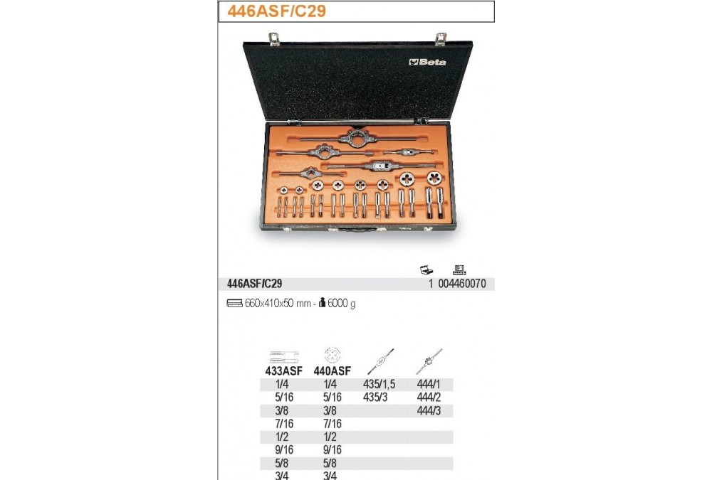 Beta Zestaw gwintowników i narzynek ze stali chromowej, gwint UNF, z akcesoriami w pudełku 29szt. 004460070 tozestaw 8-miu kompletów 2-ech gwintowników ręcznych, gwint calowy UNF (Seria 433ASF) 1/4-5/16-3/8-7/16-1/2-9/16-5/8-3/4 cali, 8-miu narzynek okrągłych, gwint calowy UNF (Seria 440ASF) 1/4-5/16-3/8-7/16-1/2-9/16-5/8-3/4 cali oraz akcesoriów: pokręteł nastawnych do gwintowników (Seria 435/1,5 i 435/3) i oprawek do narzynek (Seria 444/1, 444/2 i 444/3). Zestaw dostępny jest w pudełku o wymiarach 660x410x50 mm i wadze 6kg.