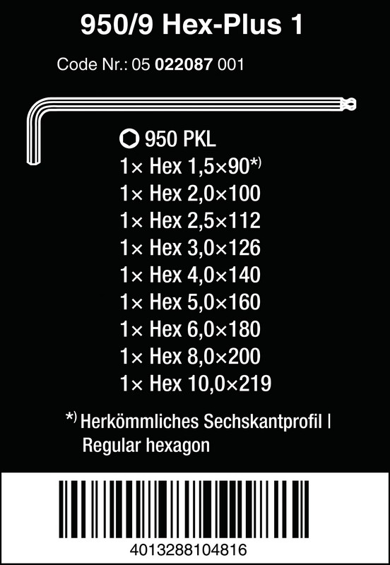 950/9 Hex-Plus 1 Zestaw kluczy trzpieniowych z kulką, chromowanych, metrycznych, 9 cz