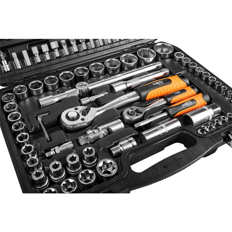 Zestaw kluczy 108 elementów 1”, 1” 10-212 marki NEO to zestaw oferowany w wygodnej walizce do przechowywania oraz transportowania narzędzi. Produkt objęty jest 25-letnim okresem gwarancyjnym. To doskonała propozycja dla profesjonalistów oraz majsterkowiczów – do zastosowań przydomowych i zawodowych.