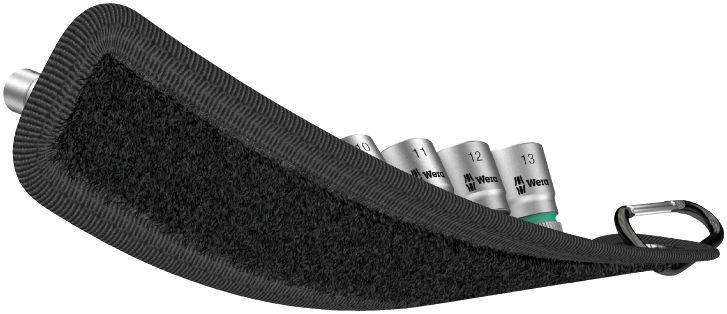 Wytrzymała zawieszka tekstylna wykonana w stylu charakterystycznym dla firmy Wera z 9 kluczami nasadowymi i narzędziem do usuwania nakrętek do pracy w ograniczonych przestrzeniach.