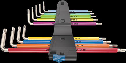 Wysokiej jakości zestaw trzpieniowych kluczy kątowych do śrub i wkrętów z gniazdem TORX®. Klucze wykonane są ze stali nierdzewnej poddanej hartowaniu podzerowemu, dzięki czemu są bardzo odporne na korozję i nie przenoszą rdzy nalotowej w połączeniach śrubowych ze stali nierdzewnej. Funkcja przytrzymywania na długim ramieniu: siła przytrzymująca, która jest wynikiem docisku końcówki narzędzia do gniazda śruby lub wkrętu, umożliwia pewne ich przytrzymanie na narzędziu. Z bardzo długim ramieniem do głęboko położonych połączeń śrubowych. Osłonka z tworzywa sztucznego ułatwia chwyt i umożliwia pracę nawet w niskich temperaturach. System wyszukiwania narzędzi "Take it easy" z oznaczeniem kolorystycznym kluczy według rozmiaru. W praktycznym uchwycie z odpornego na zużycie materiału gwarantującym pewne mocowanie kluczy i jednocześnie łatwe ich wyjmowanie.