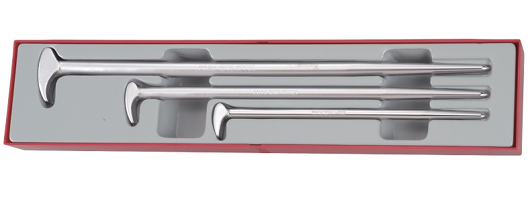 Zestaw 3 łomów. Jeden koniec łomu ma okrągło oszlifowany, spiczasty wierzchołek, drugi koniec - hakowaty. Zestaw pasuje do skrzynek i wózków narzędziowych Teng Tools.