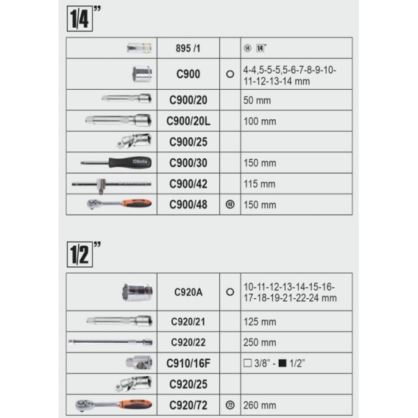 24. Nasadka sześciokątna 1/2" Beta C920A rozmiary: 10-11-12-13-14-15-16-17-18-19-21-22-24mm
