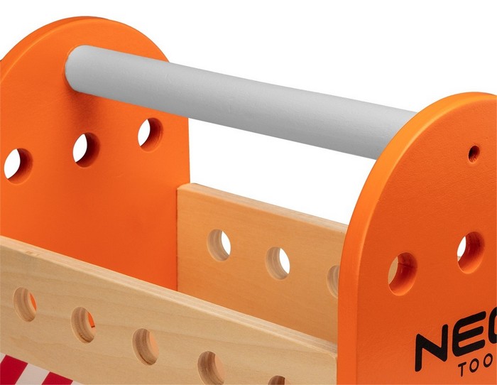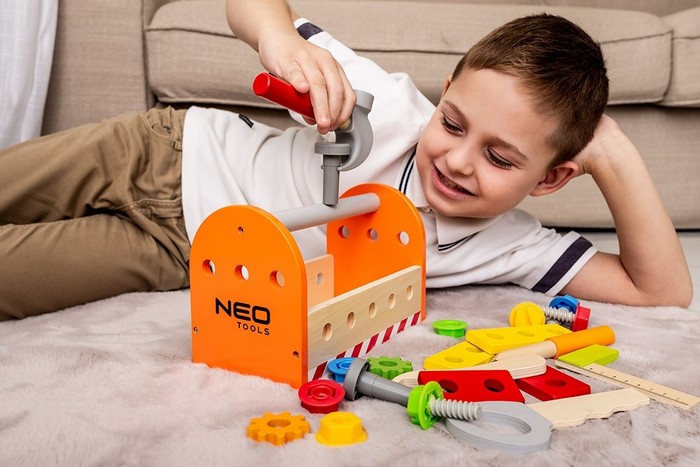 Zestaw narzędzi drewnianych dla dzieci GD022 marki NEO to zabawka edukacyjna dla dzieci powyżej 3 roku życia, składająca się na 22 indywidualne elementy – walizkę na narzędzia 1x, piłę 1x, klucz płaski 1x, listwy 1x, kątownik 1x, młotek 1x, wkrętak płaski 1x, nity 2x, koła zębate 2x, wkręty 4x, nakrętki 4x.