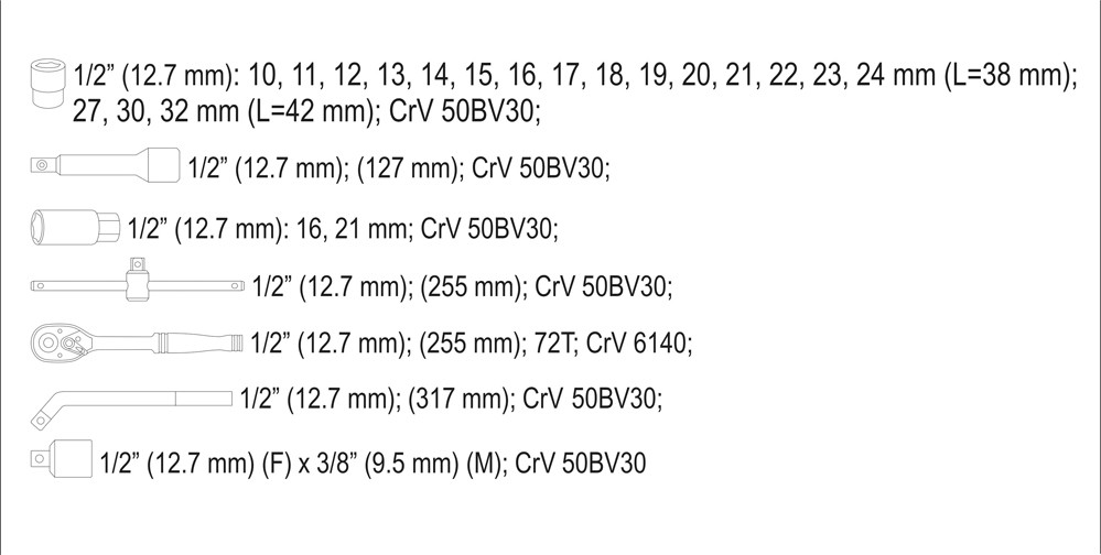 Nasadki 1/2": 10 11 12 13 14 15 16 17 18 19 20 21 22 23 24 mm, L= 38 mm, 27 30 32 mm, L= 42 mm