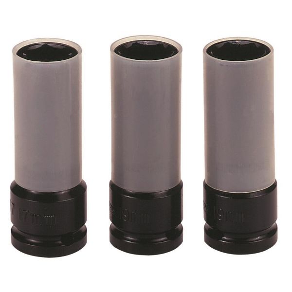 Zestaw 3 1/2" nasadek wykonanych ze stali chromowo-molibdenowej. Do nakrętek kół.
