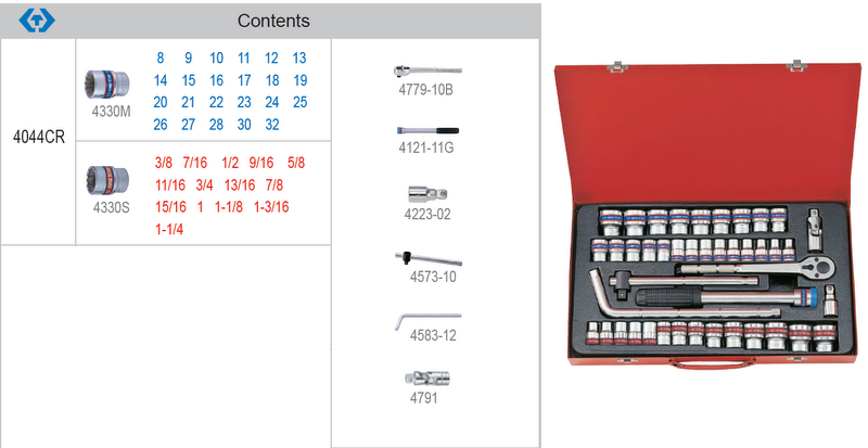 Zestaw składa się z 43 części - nasadek krótkich 12-kątnych metrycznych: 8-30mm, 32mm, 12-kątnych calowych 3/8", 7/16", 1/2", 9/16", 5/8", 11/16", 3/4", 13/16", 7/8", 15/16", 1", 1-1/8", 1-3/16", 1-1/4", grzechotka z możliwością użycia przedłużki, przedłużka do grzechotki z gumową rączką, przedłużka uchylna, pokrętło przesuwne, pokrętło L-kształtne oraz przegub Kardana.