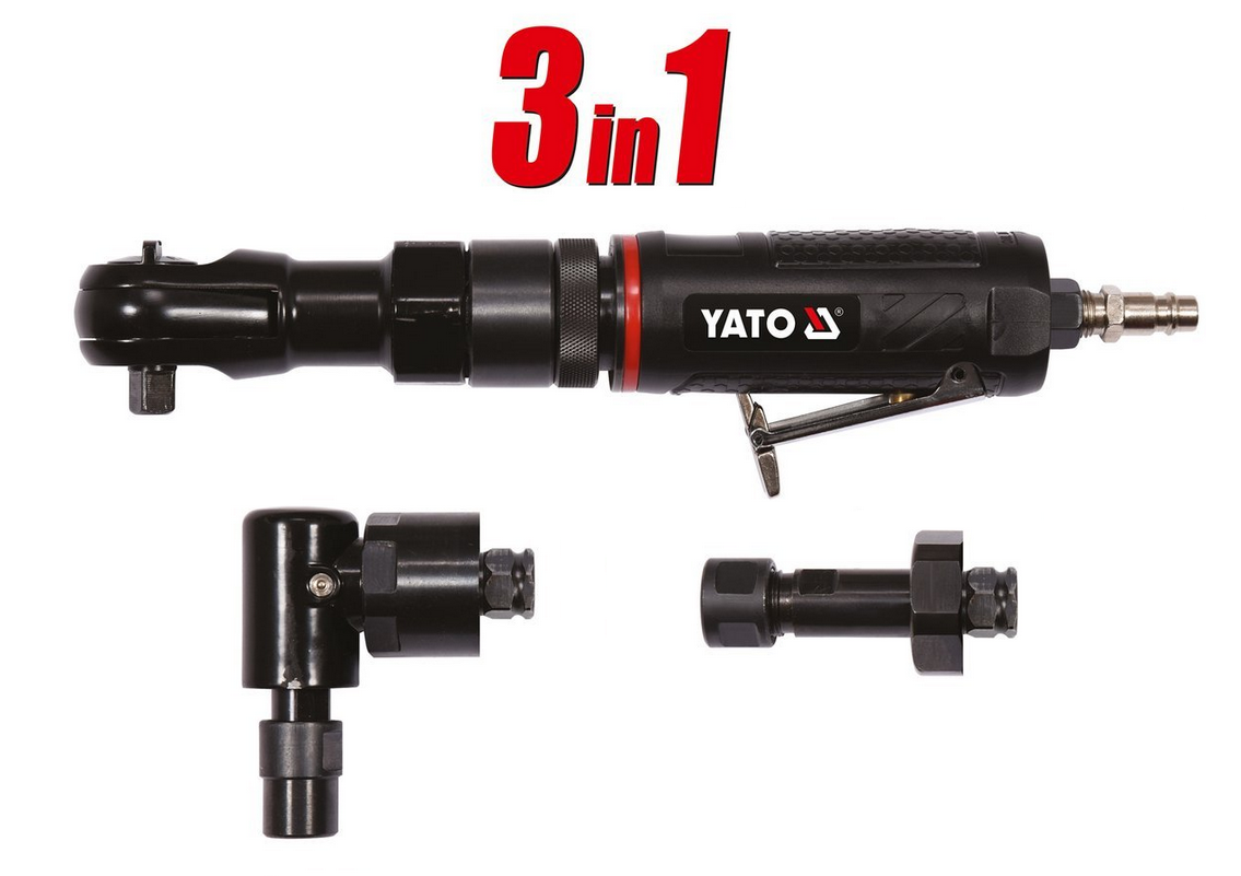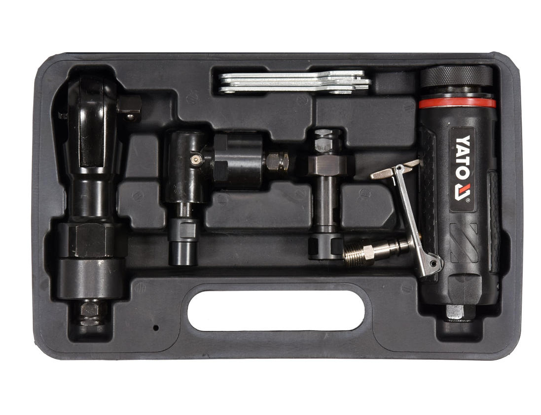 Pneumatyczny zestaw narzędzi Yato YT-09860 to grupa narzędzi do różnych zastosowań zasilanych sprężonym powietrzem. Zestaw Yato YT-09860  z wymiennymi końcówkami łączy funkcje grzechotki 1/2", szlifierki prostej oraz szlifierki kątowej z trzpieniem 6 mm. Dysponuje maksymalnym momentem obrotowym na poziomie 85 Nm, co przekłada się na skuteczność pracy i wszechstronność zastosowań. Używany w warsztatach mechanicznych, serwisach samochodowych i przemyśle.