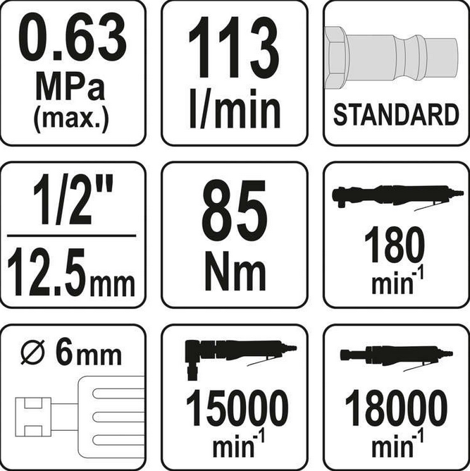 • Prędkość obrotowa: grzechotka - 180 obr./min; szlifierka prosta: 18 000 obr./min; szlifierka kątowa: 15 000 obr./min