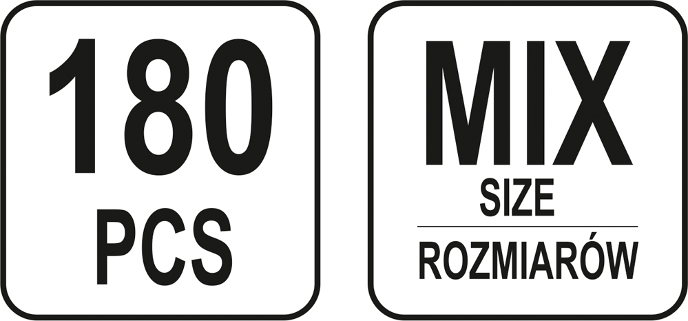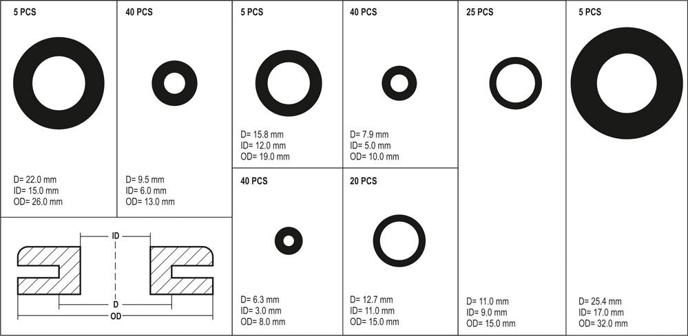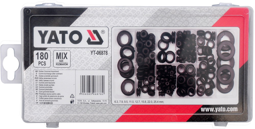 Zestaw przelotek gumowych zawiera 180 sztuk w rożnym rozmiarze.