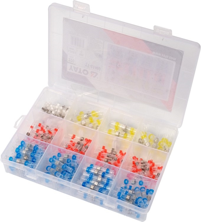 Zestaw przezroczystych rurek termokurczliwych YT-81460 z pierścieniem cyny na środku oraz dwoma pierścieniami kleju termicznego po bokach, który dodatkowo uszczelnia połączenie.