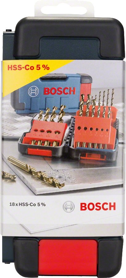 Tekst produktu, osprzęt, szary: 18-częściowy zestaw wierteł do metalu HSS-Co Toughbox, DIN 338, 135°