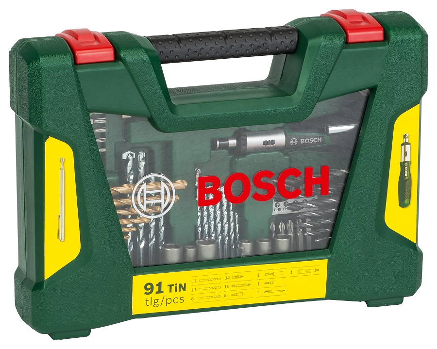 1 wkrętak ręczny, funkcja grzechotki obroty w prawo/lewo 1 pręt magnetyczny 11 wierteł HSS-TiN do metalu, O 2-8 mm 11 wierteł do muru, O 3-10 mm 8 wierteł do drewna, O 3-10 mm 15 końcówek wkręcających o długości 50 mm PH 0/1/2/3 PZ 0/1/2/3 S 6 T 10/15/20/25 H 5/6 34 końcówki wkręcające o długości 25 mm PH 0/0/1/1/2/2/3/3 PZ 0/0/1/1/2/2/3/3 S 3/5/5/7 T 10/10/15/15/20/20/25/25/30/40 H 3/5/5/6 8 kluczy nasadowych, O 6/7/8/9/10/11/12/13 mm 1 uchwyt uniwersalny, magnetyczny 1 pogłębiacz