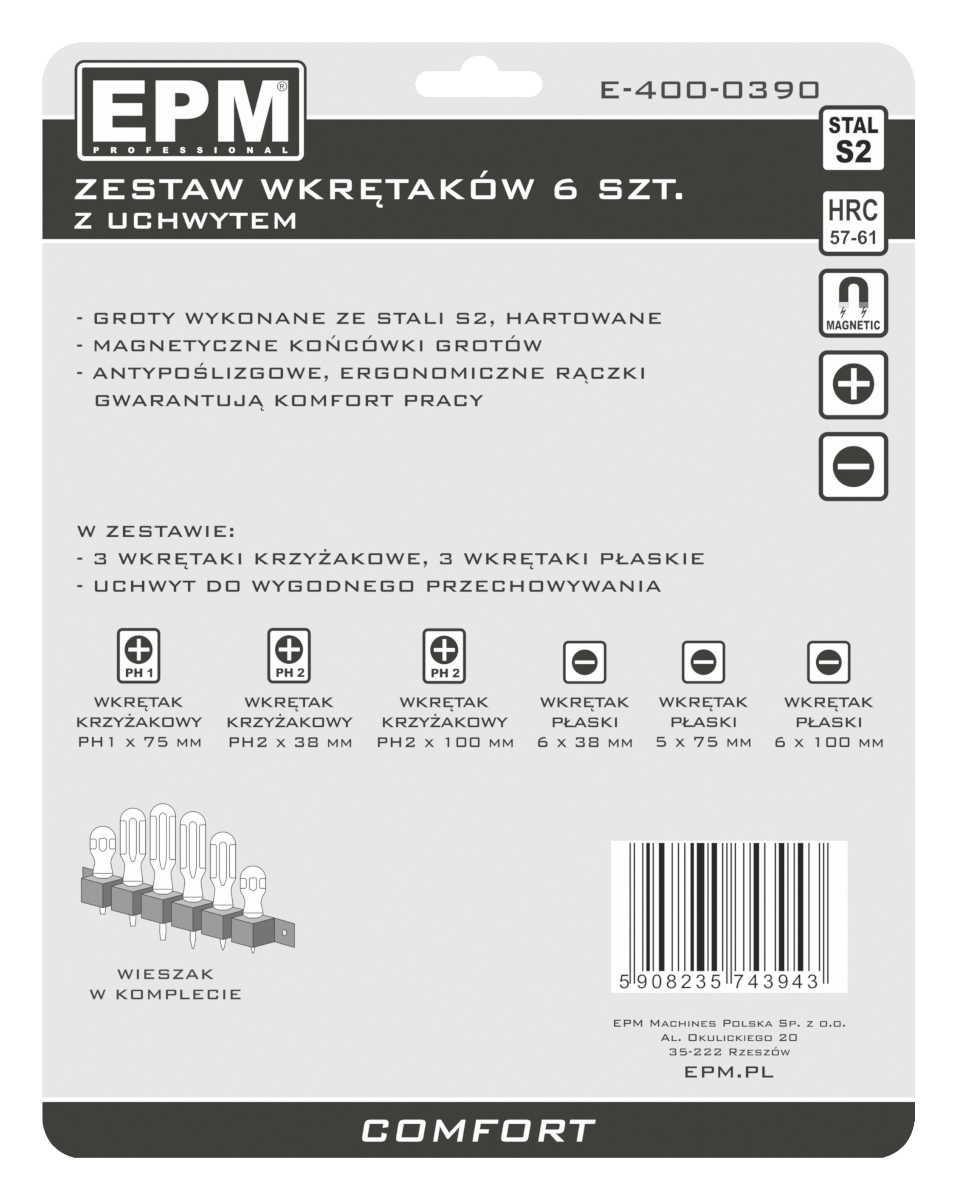 Groty wkrętaków wykonane ze stali chromowo-wanadowej CrV, hartowane, co zapewnia dużą odporność na ścieranie i trwałość grota