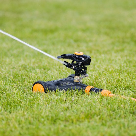 Trwały, metalowy zraszacz z łatwą regulacją zasięgu zraszania, siły strumienia i sektora nawadniania umożliwia dotarcie do każdego zakątka ogrodu